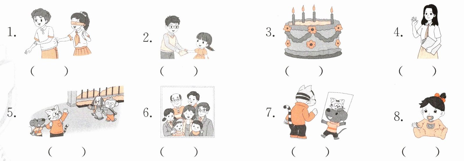 十、根据图片内容,选择相对应的对话,将其序号填在括号内。(8分)