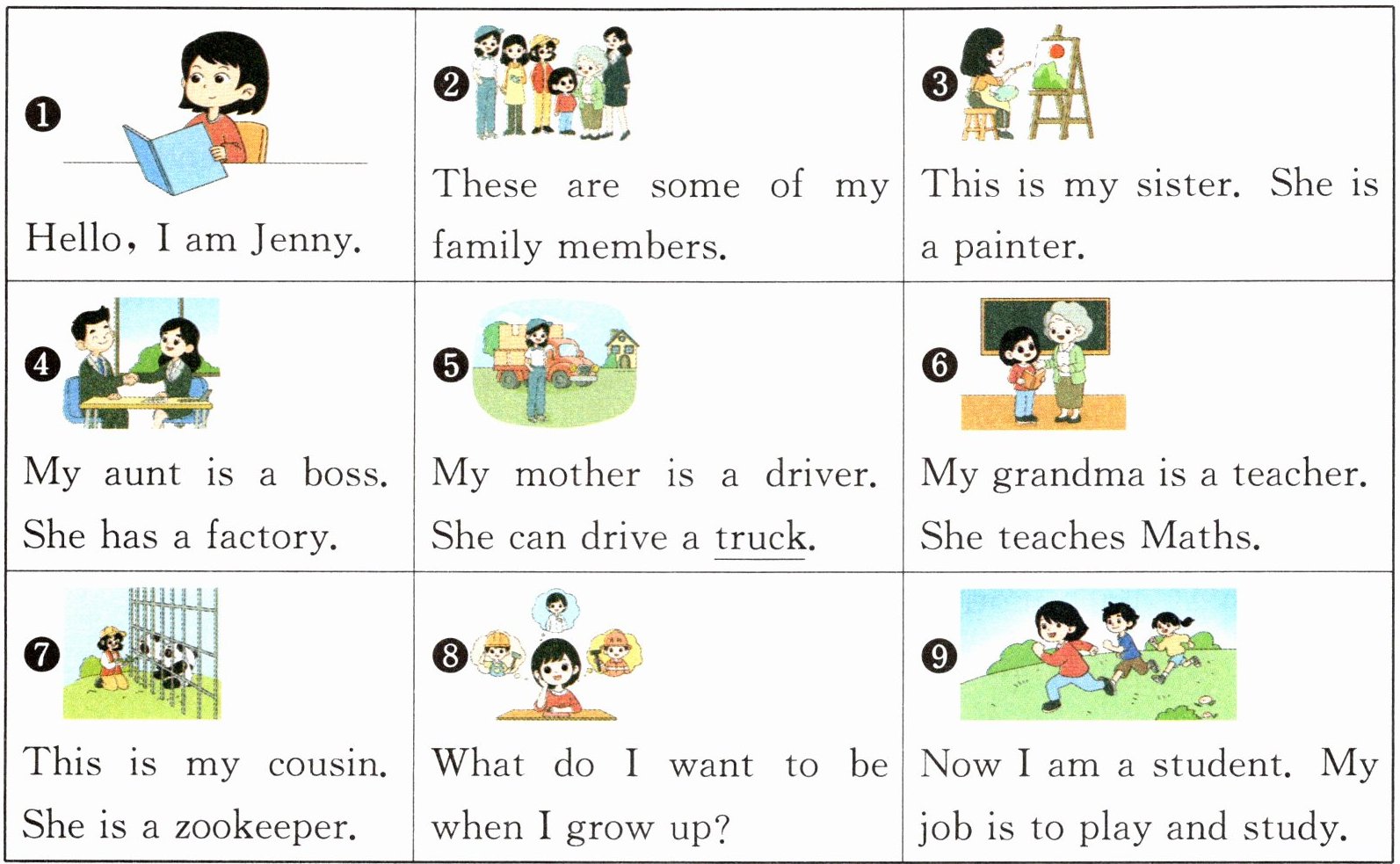 词汇积累 member /'membə(r)/ 成员 painter /'peɪntə(r)/ 画家 factory /'fæktri/ 工厂 driver /'draɪvə(r)/ 司机 grow up 长大 zookeeper /'zuːkiːpə(r)/ 动物园管理员 job /dʒɒb/ 工作 study /'stʌdi/ 学习