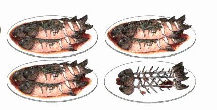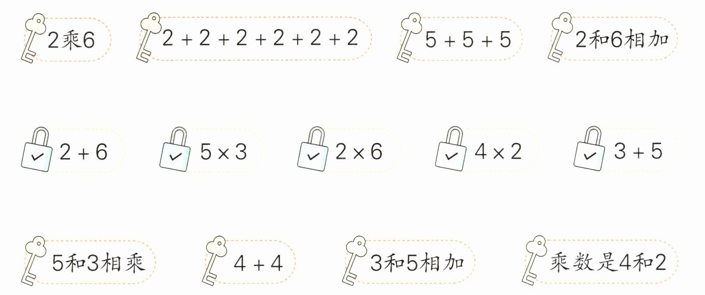 (2)3 3 3 [解析]原来有4盘鱼,每盘3条,鱼的总条数可以列算式3×4表示,吃掉一盘(3条鱼)后,变成3盘鱼,算式变为3×3。