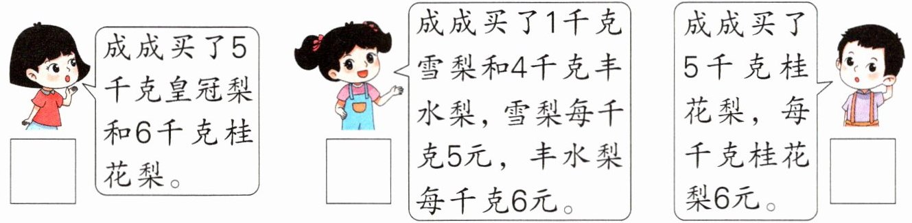 1. 家里来客人了,成成买梨招待客人。下面能用“6×5= 30”求出成成买梨花了多少钱的画“√”。