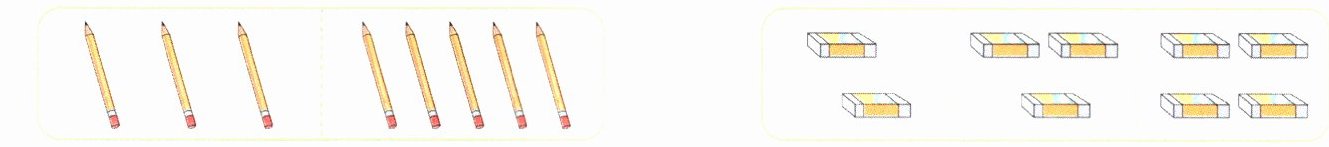 图略 2 4 3 3 【解析】左边:一共有8支铅笔,平均分成2份,求每份是多少,借助学具分一分可知,每份是4支,即每份要放4支铅笔。要想每份各有4支铅笔,从有5支铅笔的那份拿出1支放到只有3支铅笔的那份即可。右边:一共有9块橡皮,平均分成3份,求每份有几块,借助学具分一分可知,每份有3块,即每份要放3块橡皮。要想每份各有3块橡皮,从有4块橡皮的那份拿出1块放到只有2块橡皮的那份即可。