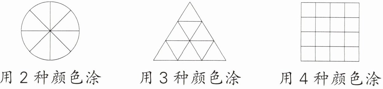 涂色略 【解析】先数出每个图形有多少块,再明确用几种颜色涂,操作时,可以先每种颜色分别涂1块,再重复这样的涂法,直到把图形涂完。以第一个图形为例,一共有8块,用2种颜色涂,例如,红色和黄色。先涂一块红色,再涂一块黄色,接着涂一块红色,再涂一块黄色,这样涂下去,可以使每种颜色涂的数量相同,且不容易出错。