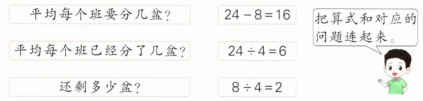 平均每个班要分几盆? 24 - 8 = 16 把算式和对应的问题连起来。