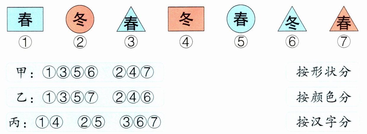 丙:①④ ②⑤ ③⑥⑦ 按汉字分