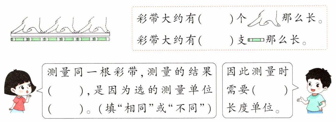 测量同一根彩带,测量的结果( ),是因为选的测量单位( )。(填“相同”或“不同”)