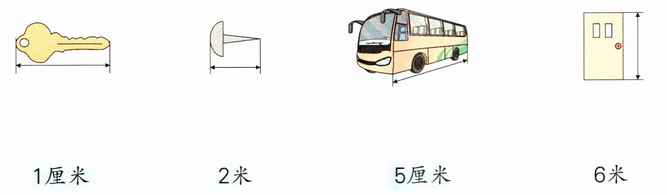 3. 【解析】钥匙和图钉较短,用“厘米”作单位合适;公交车和门较长(高),用“米”作单位合适,再结合生活实际,估一估,连一连。