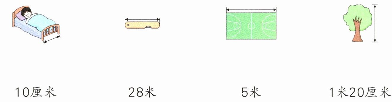 3.![img alt=3]【解析】联系生活实际来判断各个物体的长度。对于小朋友睡的床来说,10 厘米太窄,5 米和 28 米太宽,都不符合实际,所以小朋友睡的床宽1米 20 厘米;一把闭合的小刀的长度一般和二年级小朋友的一拃差不多,所以闭合的小刀长 10 厘米比较合适;一个标准篮球场的长边是 28 米,短边是 15米;一棵树高5米符合实际。