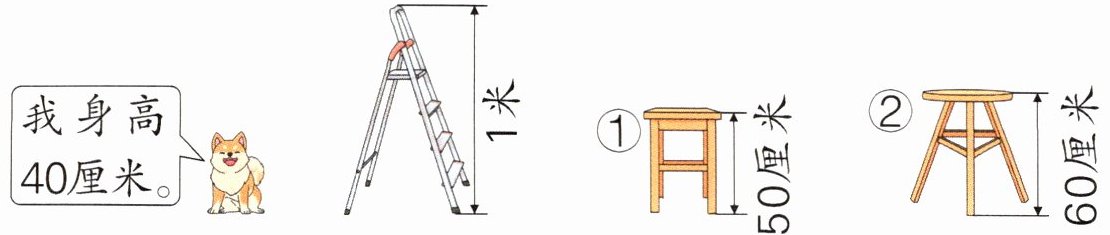 (1)① 【解析】本题需要结合生活实际进行想象和对照。二年级学生的身高大约在1米20厘米左右,观察发现课桌比二年级学生矮,而电线杆比二年级学生高很多,只有冰箱是比二年级学生高一些的,符合要求。