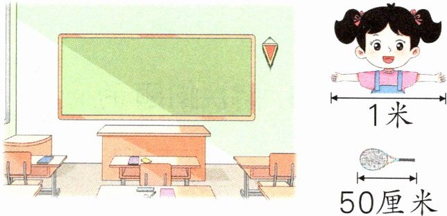 (2)一个网球拍长50厘米,2个网球拍的长是1米,6米里有6个1米,6×2=12(个),即12个网球拍的长是6米,也就是教室的宽。