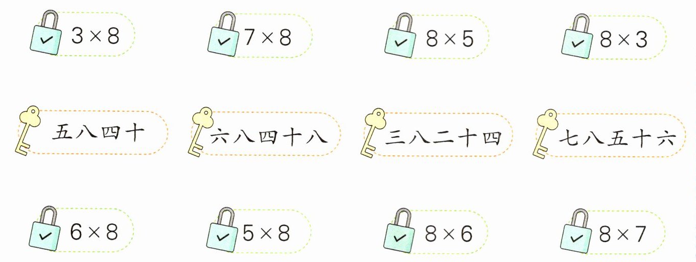 [解析]左图中有5串铃铛,每串有8个,求5个8的和是多少,列乘法算式为8×5=40;右图中有8串小丸子,每串有3颗,求8个3的和是多少,列乘法算式为3×8=24。