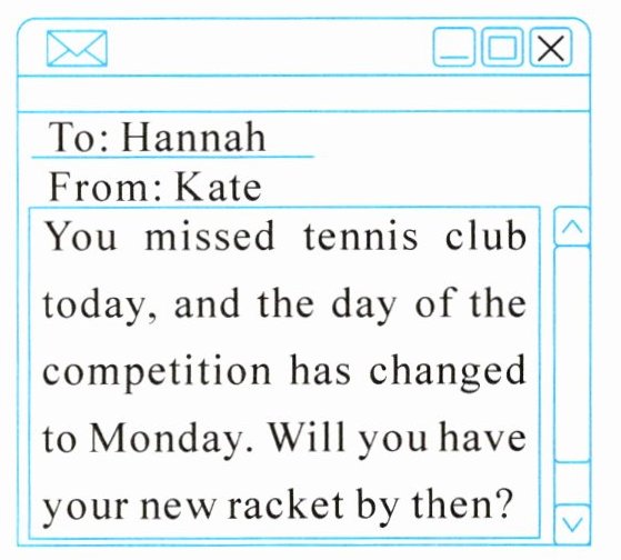 You missed tennis club today, and the day of the competition has changed to Monday. Will you have your new racket by then?