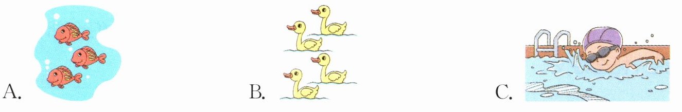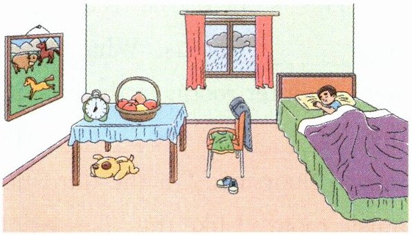 six thirty, hot, shorts, chair, cat, horse, cows (提示:1. 闹钟时间;2. 窗外下雨;3. 椅子上的长裤;4. 桌子下的狗;5. 墙上的画。)