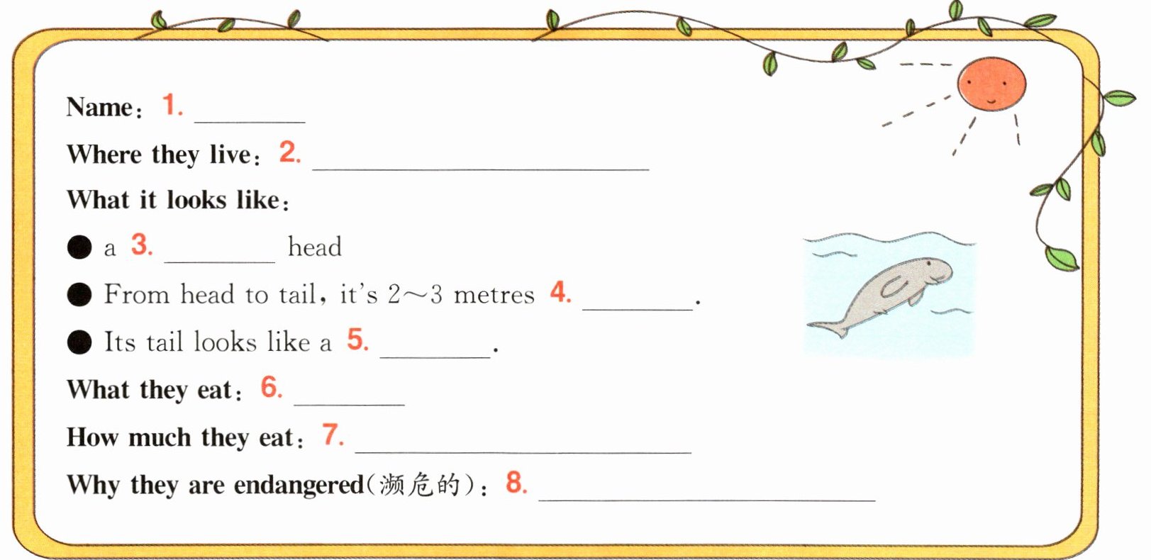 1. dugong 2. in the South China Sea 3. round 4. long 5. whale's 6. seagrass 7. 40 to 50 kilograms of seagrass every day 8. They can't find enough seagrass to eat.