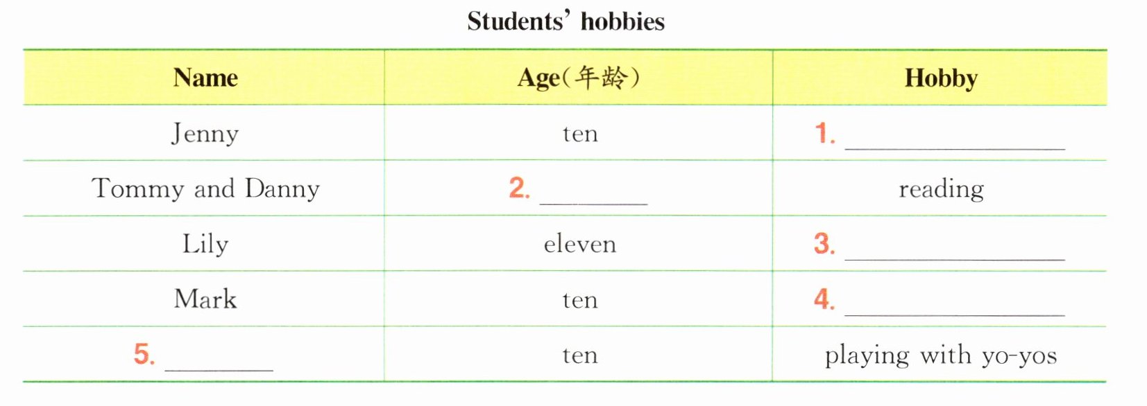 My name is Sam. I'm ten years old. My friends and I have many hobbies. Jenny is ten. She likes playing football. She can play it very well. Tommy and Danny are eleven. They both like reading. They have a lot of picture books. Lily is eleven too. She likes skiing. Mark is ten. He likes climbing. I like playing with yo-yos. I usually play with my friends. We feel very happy every day.