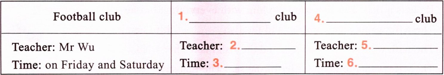 Do you like playing football? Mr Wu can teach you. Come and join the football club! You can have lessons on Friday and Saturday. Our school has a football game every year. What about taking part in it next year?