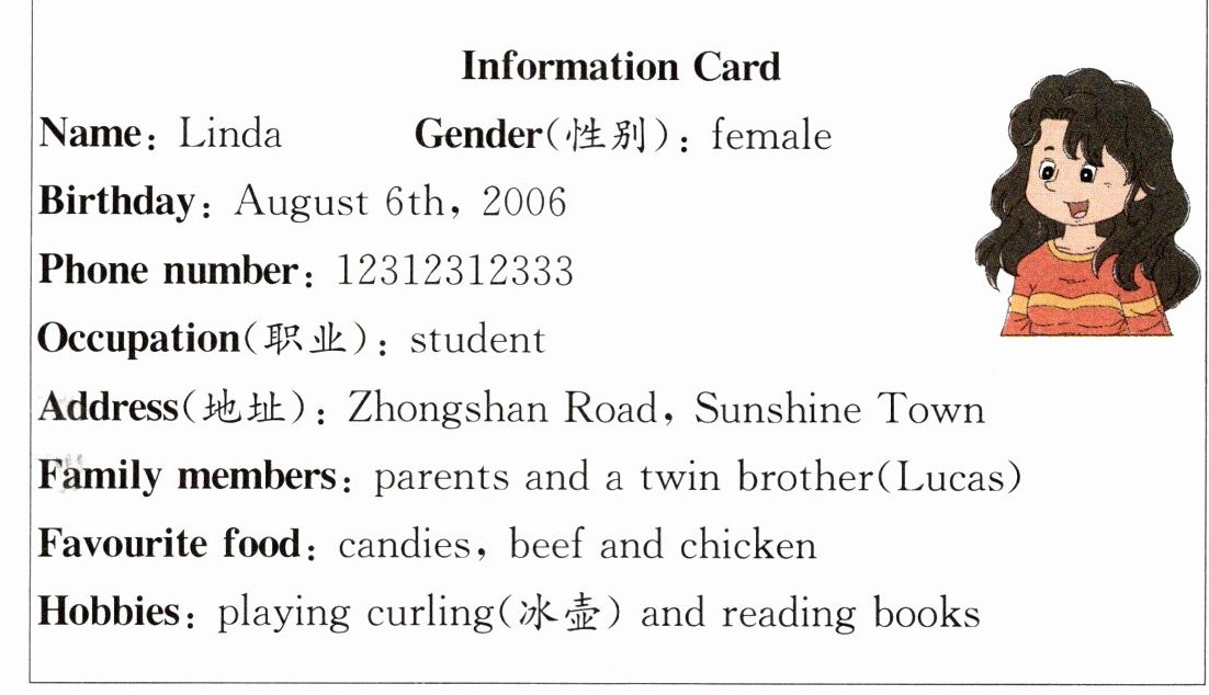 六、新语境 个人信息卡 Linda 是阳光大学的一名学生,阅读 Linda 的个人信息卡,选择正确的答案。