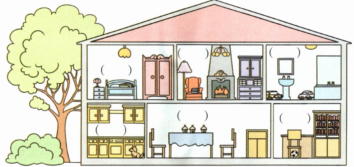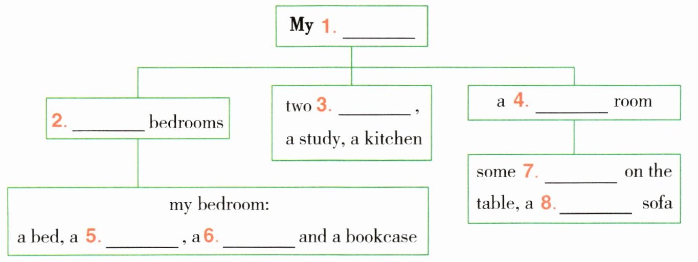 1. house 2. four 3. bathrooms 4. living 5. desk 6. chair 7. flowers 8. soft