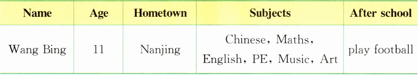 My friend is Wang Bing. He is eleven years old. He lives in Nanjing. He studies Chinese, Maths, English, PE, Music and Art at school. He likes Art. He is good at drawing. After school, he usually plays football with me in the playground. We help each other. We are good friends.