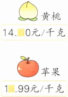 5. 如图,下面每种水果的单价都被■挡住了一个数字。李奶奶带了90元钱,买了5 kg黄桃后,剩下的钱够买2 kg苹果吗?