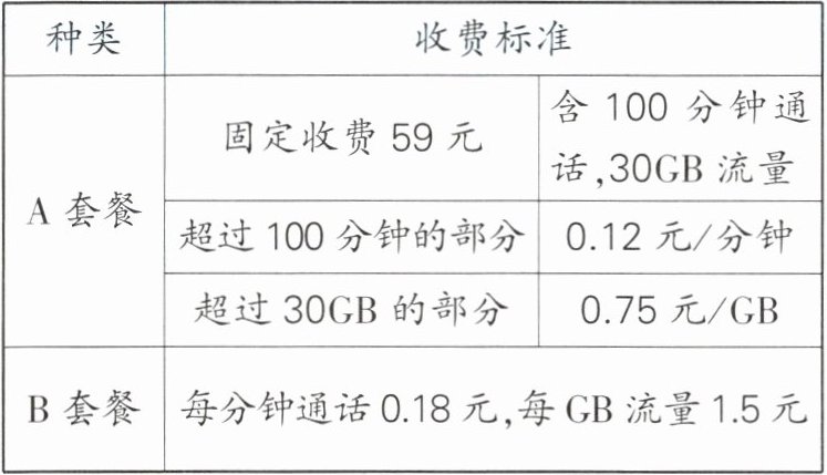 【解析】A套餐的资费包含固定费用59元,超过100分钟的通话费用和超过30GB的流量费用。B套餐的资费包含全部通话费用和全部流量费用。根据所消耗的通话时长和流量来分别分段计算费用,再求总资费,最后进行比较。