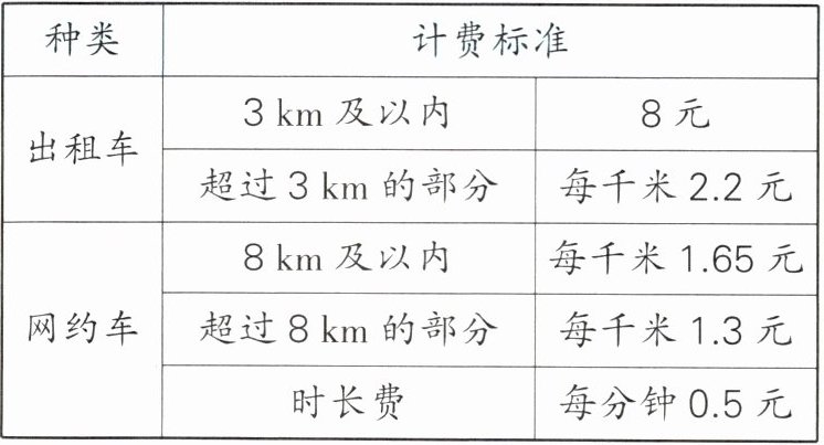 4.李叔叔要去18 km外的车站接人,单程耗时大约20分钟(来回用时相同,接到人后不换车直接走,在车站的停留时间不计),可乘出租车或网约车。两种车的计费标准如下表所示,分别计算出李叔叔乘坐出租车和网约车往返所花的车费,他选择哪种车更合算?