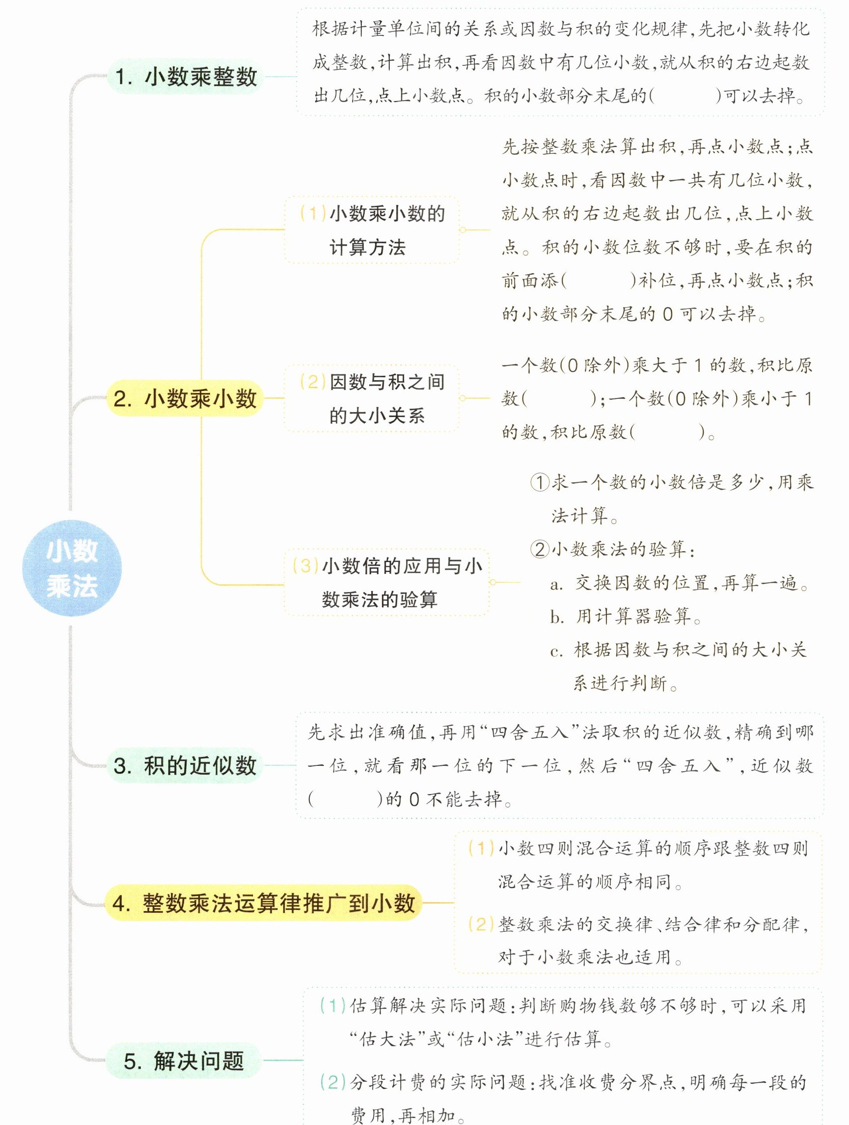 根据计量单位间的关系或因数与积的变化规律,先把小数转化成整数,计算出积,再看因数中有几位小数,就从积的右边起数出几位,点上小数点。积的小数部分末尾的( )可以去掉。