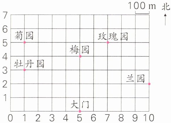 (1)菊园的位置是(1,5),则大门的位置是( , ),梅园的位置是( , )。