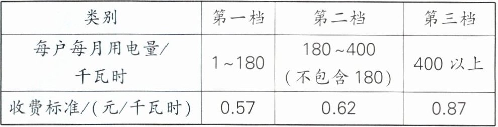 | 每户每月用电量/千瓦时 | 1~180 | 180~400(不包含180) | 400以上 |