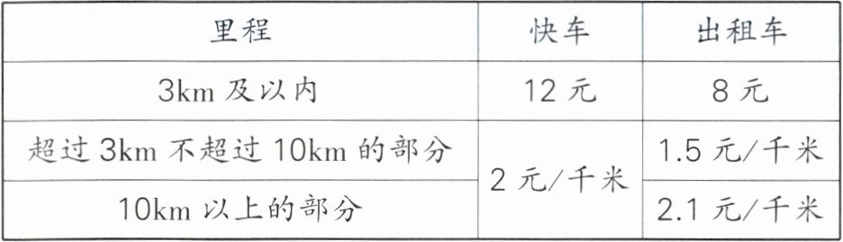 【解析】根据收费标准,去离家20 km的机场,乘快车的费用=3 km部分的费用+(20-3)km部分的费用,乘出租车的费用=3 km部分的费用+(10-3)km部分的费用+(20-10)km部分的费用,将两者进行比较后选择即可。