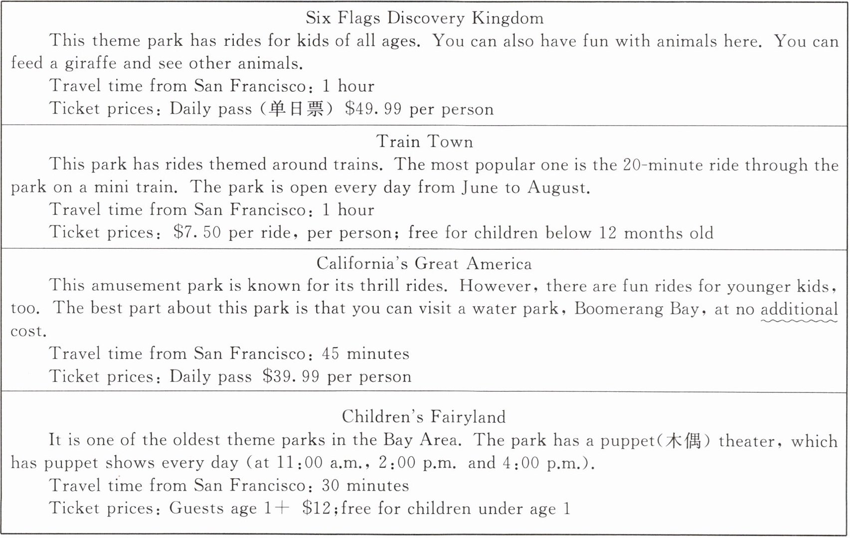 | This theme park has rides for kids of all ages. You can also have fun with animals here. You can feed a giraffe and see other animals. Travel time from San Francisco: 1 hour Ticket prices: Daily pass(单日票)$49.99 per person || Train Town || This park has rides themed around trains. The most popular one is the 20-minute ride through the park on a mini train. The park is open every day from June to August. Travel time from San Francisco: 1 hour Ticket prices: $7.50 per ride,per person;free for children below 12 months old |