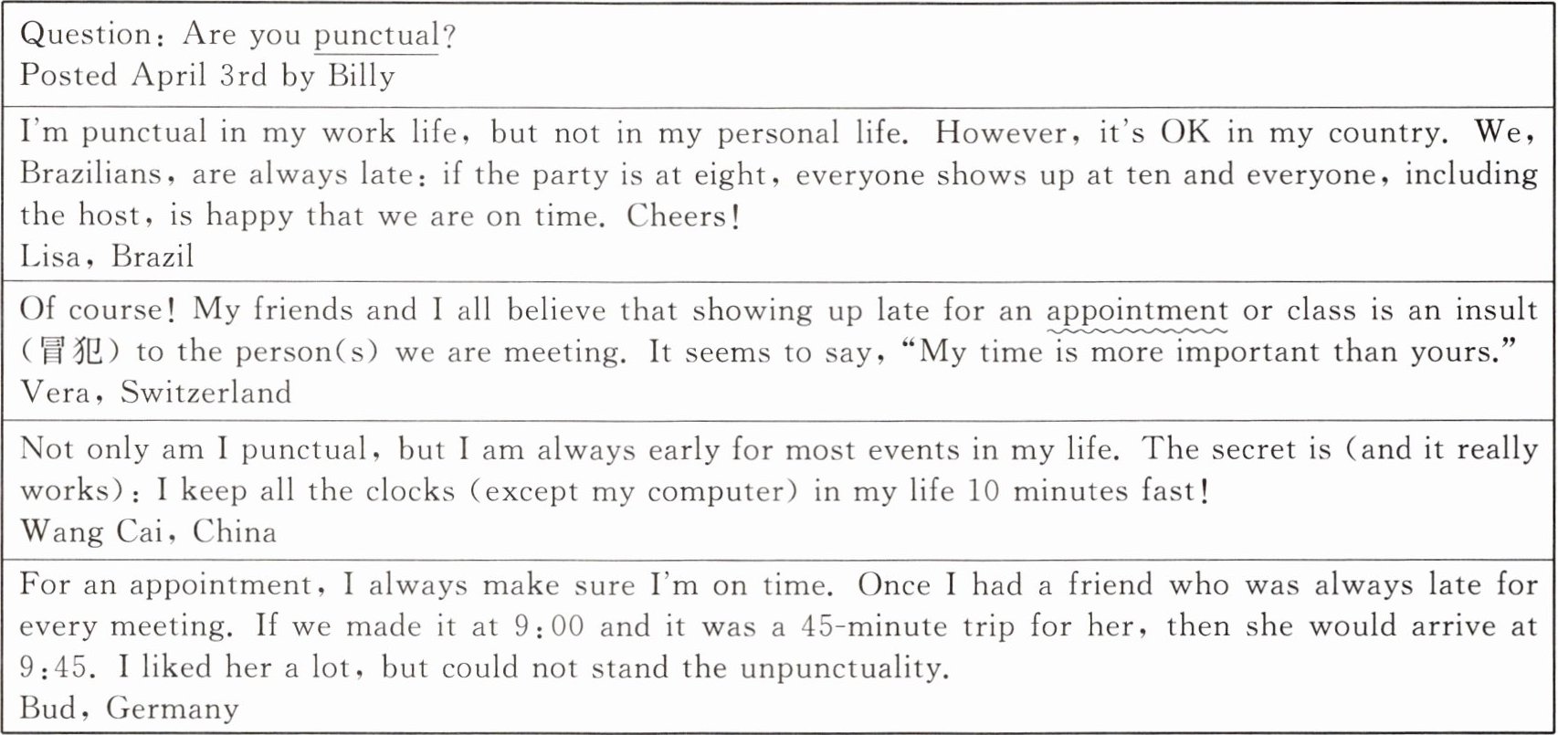 Of course! My friends and I all believe that showing up late for an appointment or class is an insult(冒犯)to the person(s) we are meeting. It seems to say,"My time is more important than yours."