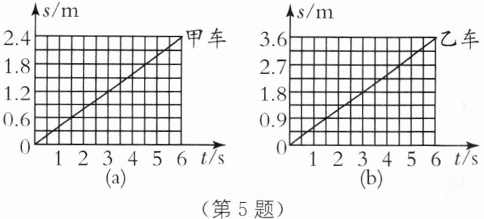 (2)由题图(b)可知,乙车行驶3.6 m,用时6 s,则乙车速度$v_{乙}=\frac {s_{乙}}{t_{乙}}=\frac {3.6m}{6s}=$$0.6m/s$,经过5 s,乙车通过的路程$s_{乙}'=v_{乙}t_{乙}'=0.6m/s×$$5s=3m$.