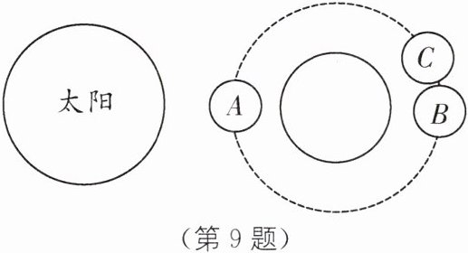 食.当地球上某些位置的人观察到月偏食时,月球位于图中A、B、C中的C