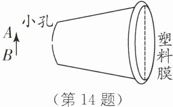 14. (2024·白银中考)如图所示是小强在纸杯上蒙上一层塑料膜做小孔成像实验的情景,请在图中作出烛焰(用AB表示)在塑料膜上成的像(用箭头A'B'表示)及光路图.