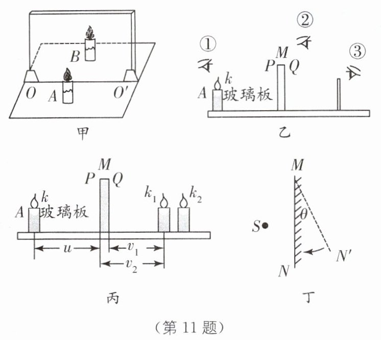 (3)在实验中采用的是厚玻璃板,观察到蜡烛A通过玻璃板成了两个清晰的像k₁和k₂,则像k₁的像距为v₂。在题图丙中k₁和k₂两个像中间放置一块不透明薄挡板,不影响物体成像,在蜡烛A这一侧通过玻璃板能看到k₁和k₂。