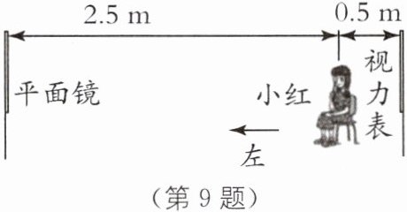 (3)由题图可知,小红原来距离平面镜2.5m,测试要求小红距离她观察的视力表5m,则小红应该向左移动3m + 2.5m - 5m = 0.5m。