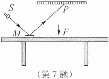 7. 如图所示,为观察微小形变的装置. 平面镜 M 放置在水平桌面上,光源 S 发出一束激光射到镜面上,经反射后在标尺上形成光斑 P. 若在图示位置用力 F 向下挤压桌面,则(