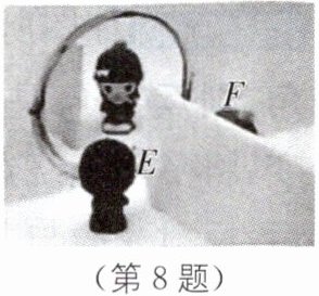 8. 教材 P60 图 2-48·拓展 (2025·无锡期末)如图所示,被隔板隔开的两个人偶不能直接“看到”对方,但人偶 E 可以从平面镜中“看到”人偶 F. 下列说法中正确的是(