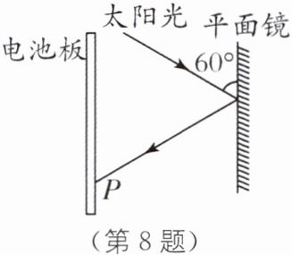8. (2024·南京鼓楼区期中)小明在房间中安装了一块太阳能电池板给家里供电.当太阳在电池板后方时,利用一块平面镜将太阳光反射到电池板上.若某时刻太阳光与平面镜的夹角为 60°(如图所示),一束阳光经镜面反射后照射到电池板上 P 点,则下列说法正确的是(
