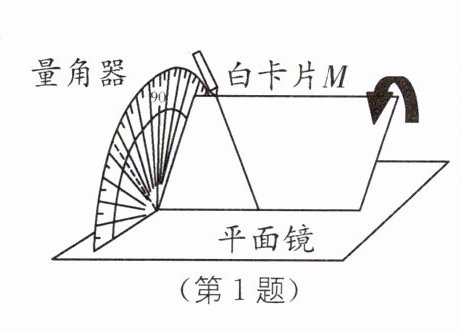 1. 如图所示,在“探究光的反射定律”的实验中,平面镜水平放置,量角器垂直粘贴于平面镜上,白卡片一侧紧贴量角器倾斜置于平面镜上,将激光笔夹在白卡片M上,并沿M表面射出一束激光.