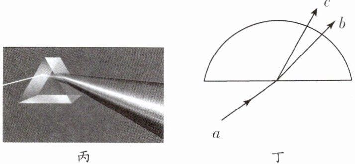 (4)图丁中,a是一束白光,射向半圆玻璃砖的圆心,折射后发生了色散,b、c为最外侧的两束光.下列说法错误的一项是