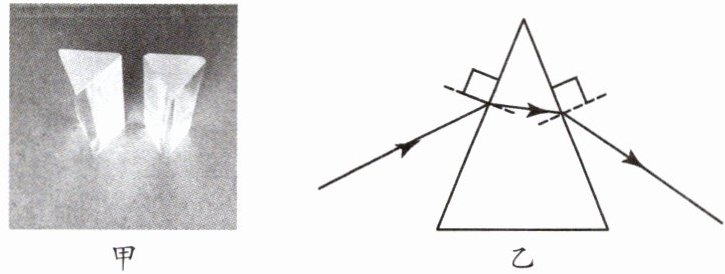 折射时的色散光学研究常常用到如图甲所示的三棱镜,简称棱镜.根据折射定律,一束光线射入后将沿图乙的方向射出,即光通过棱镜后将向它的横截面的底边方向偏折.