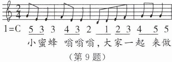 9. 如图所示是童谣“小蜜蜂”的一段歌词与乐谱,当小玲唱到“大家一起”这四个字期间,音调逐渐升高.关于这期间小玲声音变化的描述正确的是(