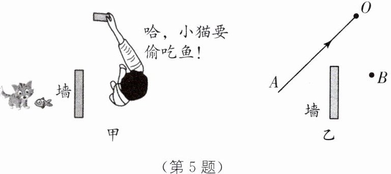 5. (2024·成都中考)如图甲所示,小孟利用一面小镜子隔墙看到院里的小猫要偷吃鱼。如图乙所示,AO 表示来自小猫的入射光线,O 点为入射点,B 点为小孟眼睛所在位置。请在图乙中完成作图:①画出反射光线 OB;②根据光的反射定律画出镜面。(镜面用////////表示,保留作图痕迹)