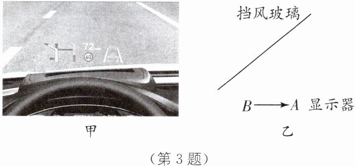 3. 为了避免驾驶员低头观看仪表信息而造成交通事故,车内安装了如图甲所示的抬头显示器(简称 HUD)。通过前挡风玻璃可呈现水平显示器上的重要行车数据,方便司机查看。请在图乙中画出显示器 AB 在挡风玻璃中所成的像。