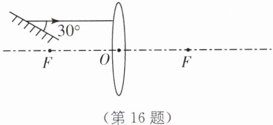 16. 图中的光线经过平面镜反射后水平射向竖直放置的凸透镜,请画出平面镜的入射光线和凸透镜的折射光线。