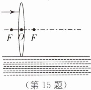 15. (2024·达州中考)一束平行于主光轴的光线,经凸透镜折射后在水面发生反射和折射,请完成光路图。
