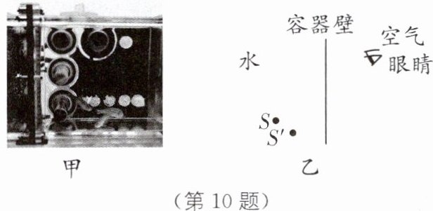 10. 新情境 太空养鱼 (2024·菏泽中考)2024 年 4 月 26 日,神舟十八号载人飞船成功对接中国空间站,装有 4 条斑马鱼的特制透明容器顺利转移到问天实验舱,如图甲所示。请你在图乙中画出航天员看到斑马鱼的光路图(S 表示斑马鱼的实际位置,S'表示航天员看到的斑马鱼像的位置,不考虑容器壁对光线的影响)。