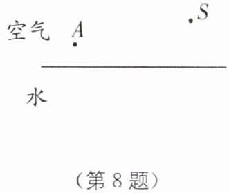 8. 如图所示,由发光点 A 发出的光射到水面上,同时发生反射和折射,反射光线经过 S 点,试在图中画出入射光线、反射光线和大致的折射光线。
