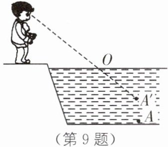 9. 新情境 安全与健康 在防溺水教育活动中,老师告诉学生,池塘里水的实际深度比看起来的深度要深,不能贸然下水游泳。如图所示为解释这一现象的情景,其中 A 为水底的物体,A'是岸边儿童看到的 A 的像。请你在图中作出过 O 点的入射光线和折射光线。